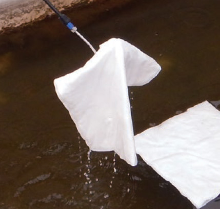 流れのある水面に長く浮かべた時にも、多量の油を吸わせて水面から引き上げる時にも、破れたりせず、二次汚染を防ぎます。